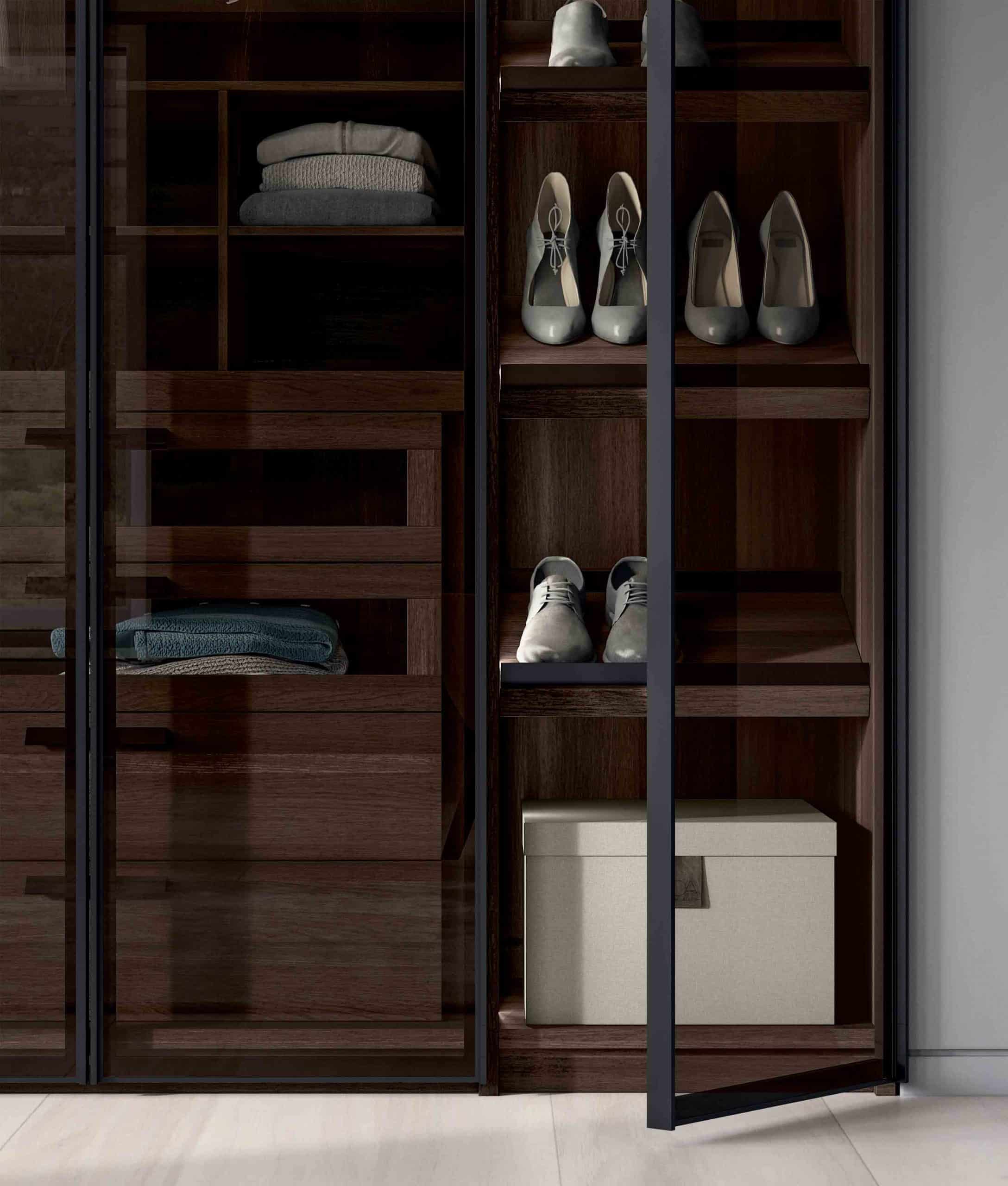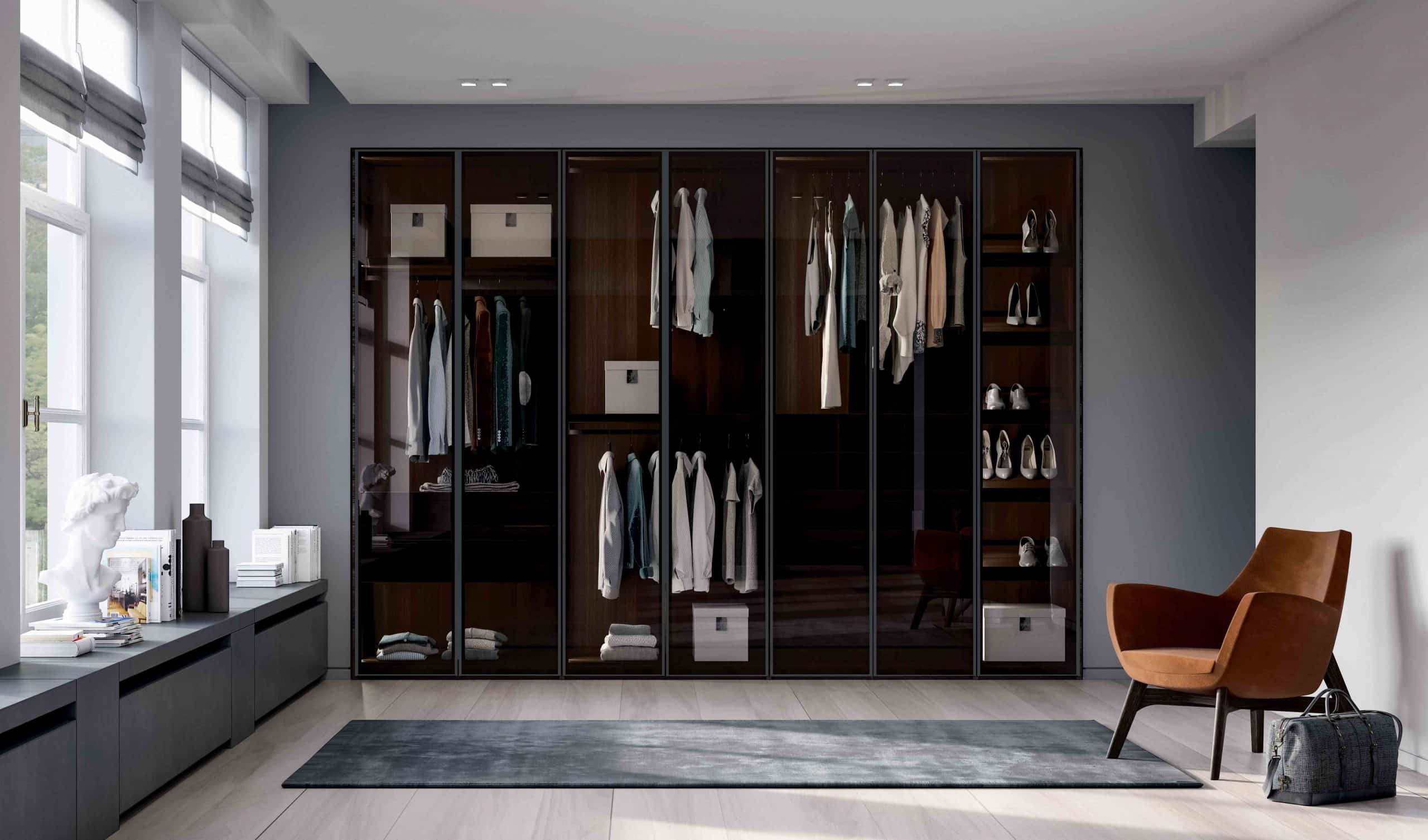 The Glass Up hinged door closet in clear glass is for those who prefer visually light solutions that allow a glimpse of the interior. This gives room for maximum customization: how will you equip this universe of yours with drawers, shelves, rasters, shoe racks and other accessories?
