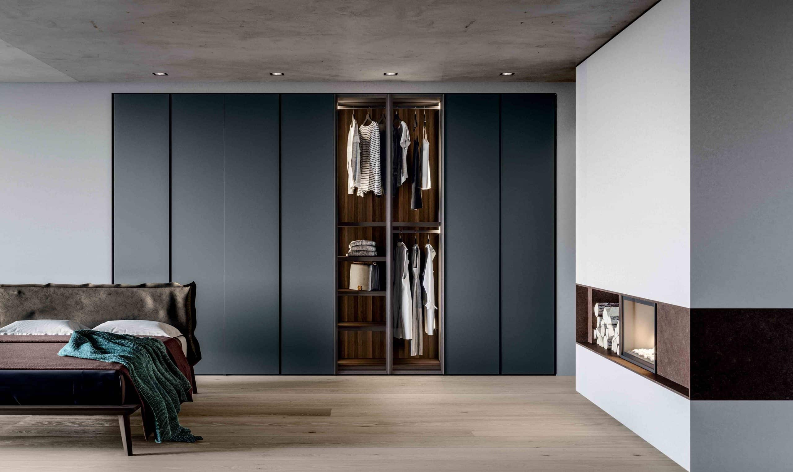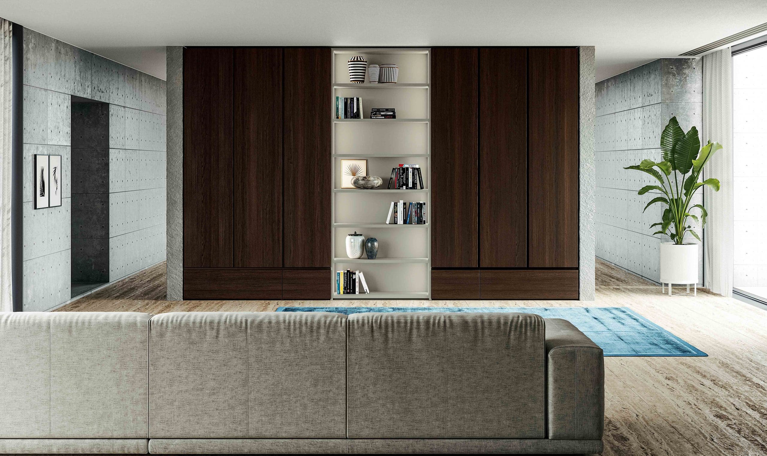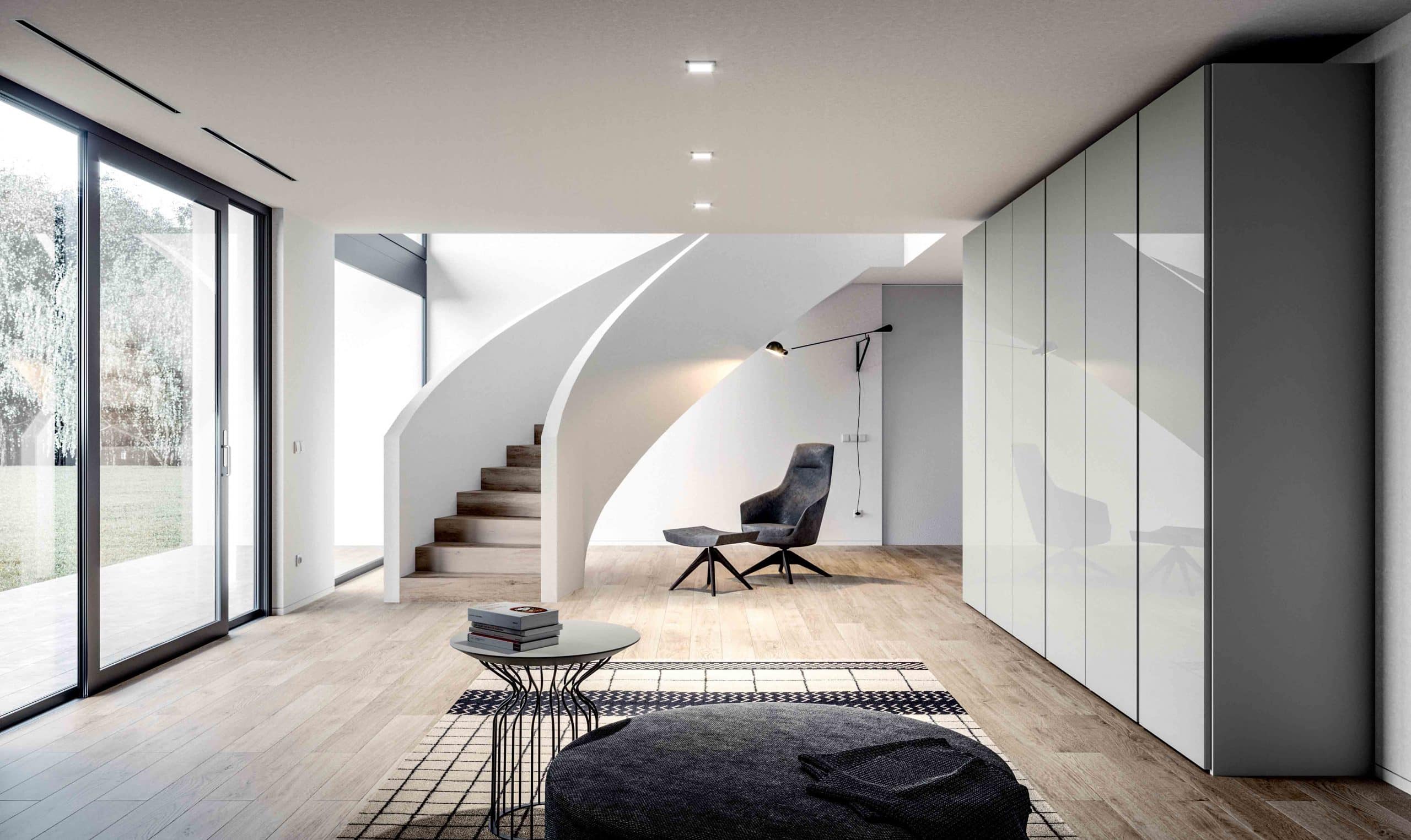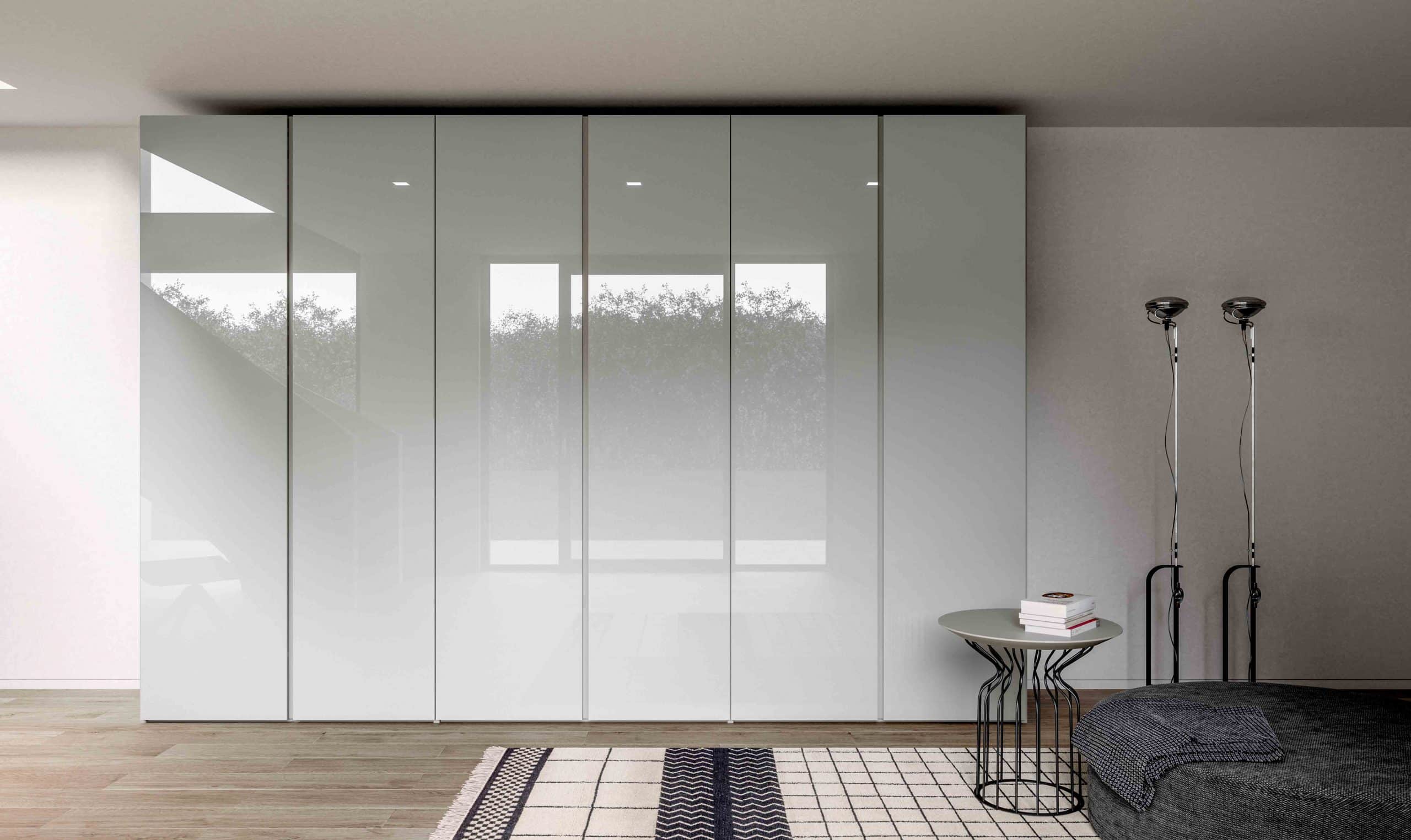 The Tecno hinged door closet is linear and rigorous, capable of reinventing itself thanks to its rich modularity and wide range of finishes. You can choose from wood essences, matte, glossy and special lacquers, and lacquered or mirrored glass.