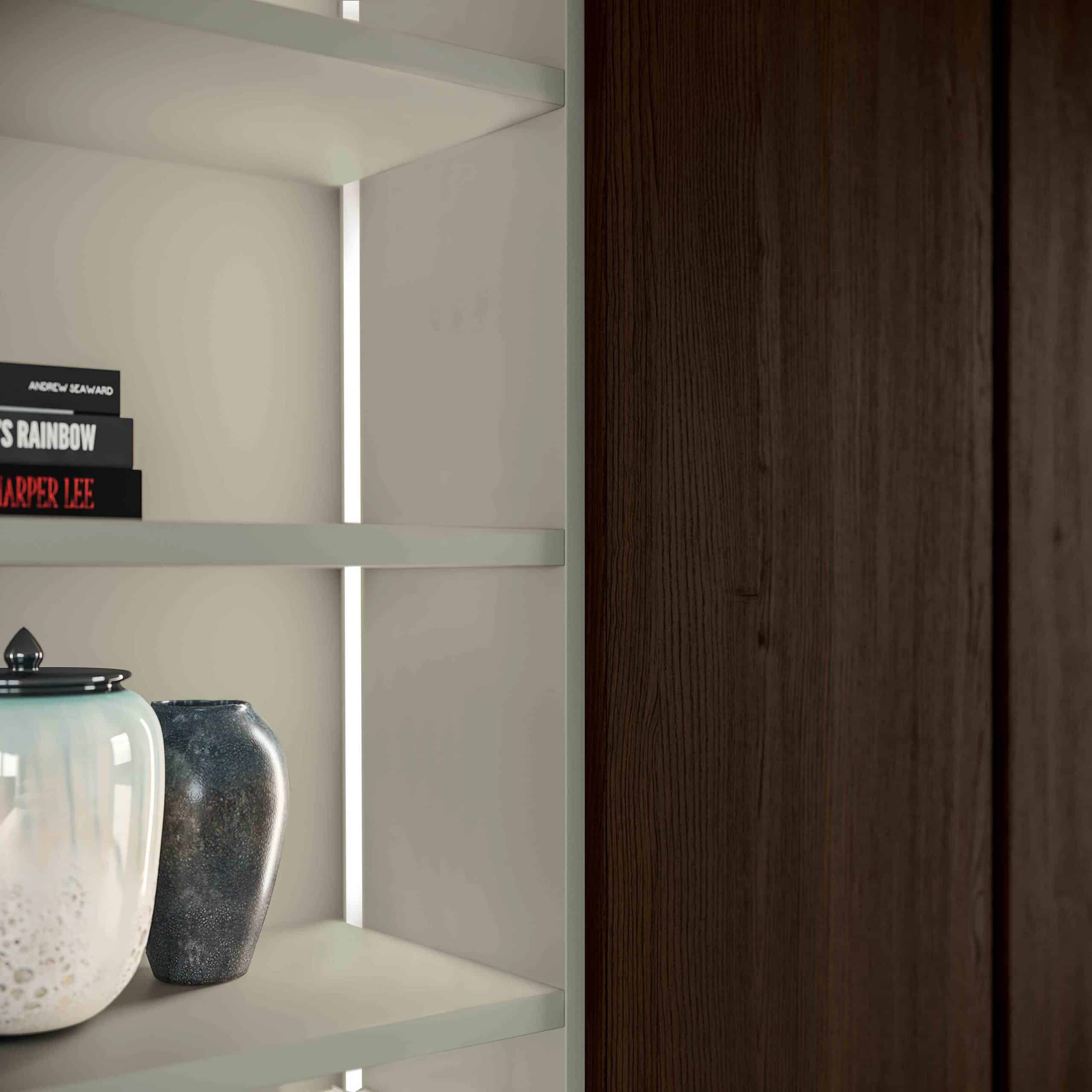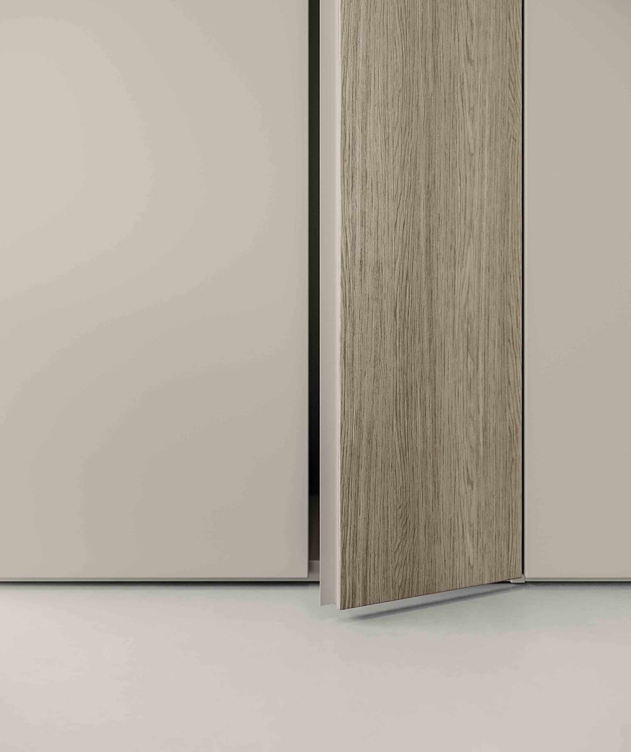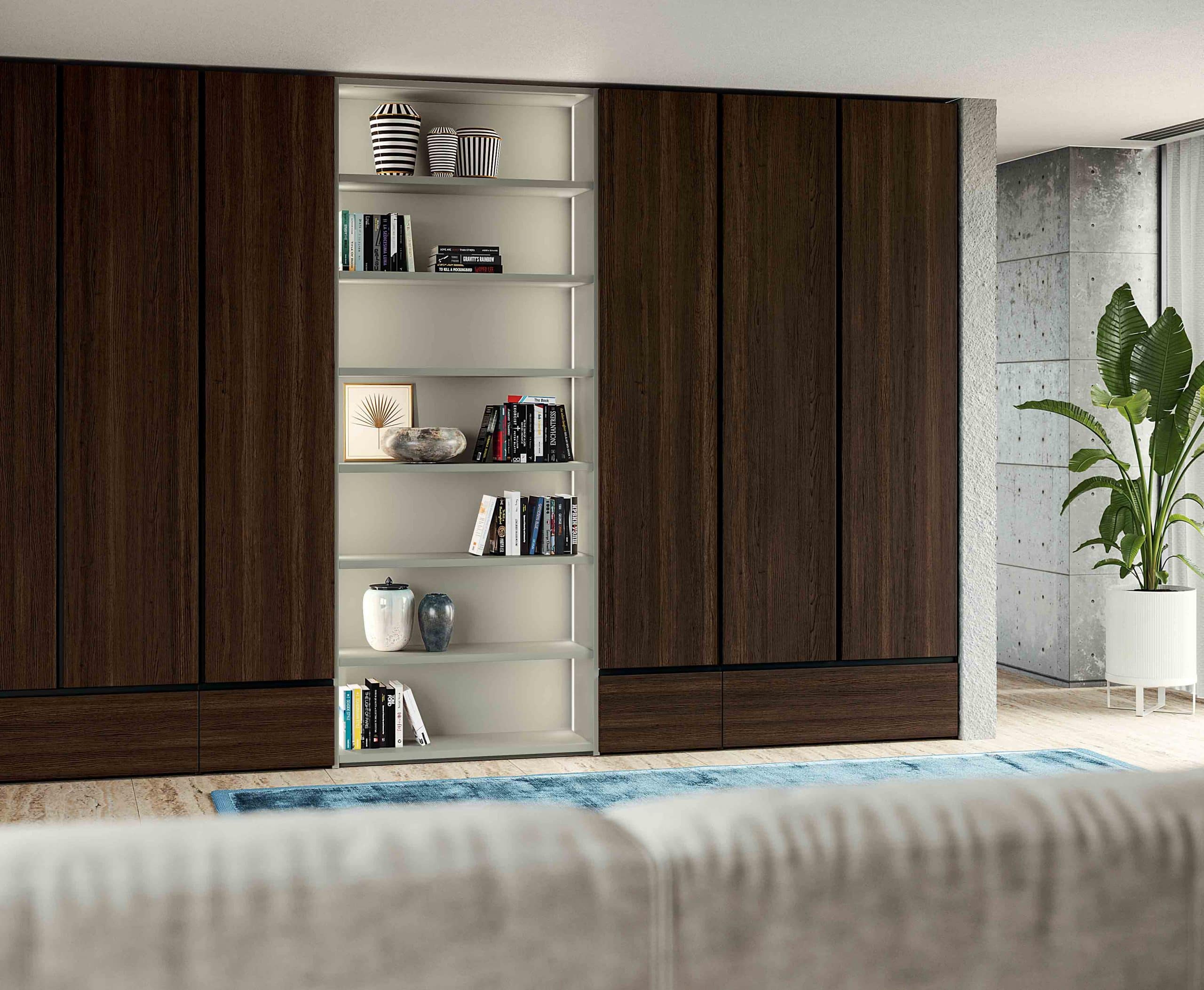 The Tecno hinged door closet is linear and rigorous, capable of reinventing itself thanks to its rich modularity and wide range of finishes. You can choose from wood essences, matte, glossy and special lacquers, and lacquered or mirrored glass.