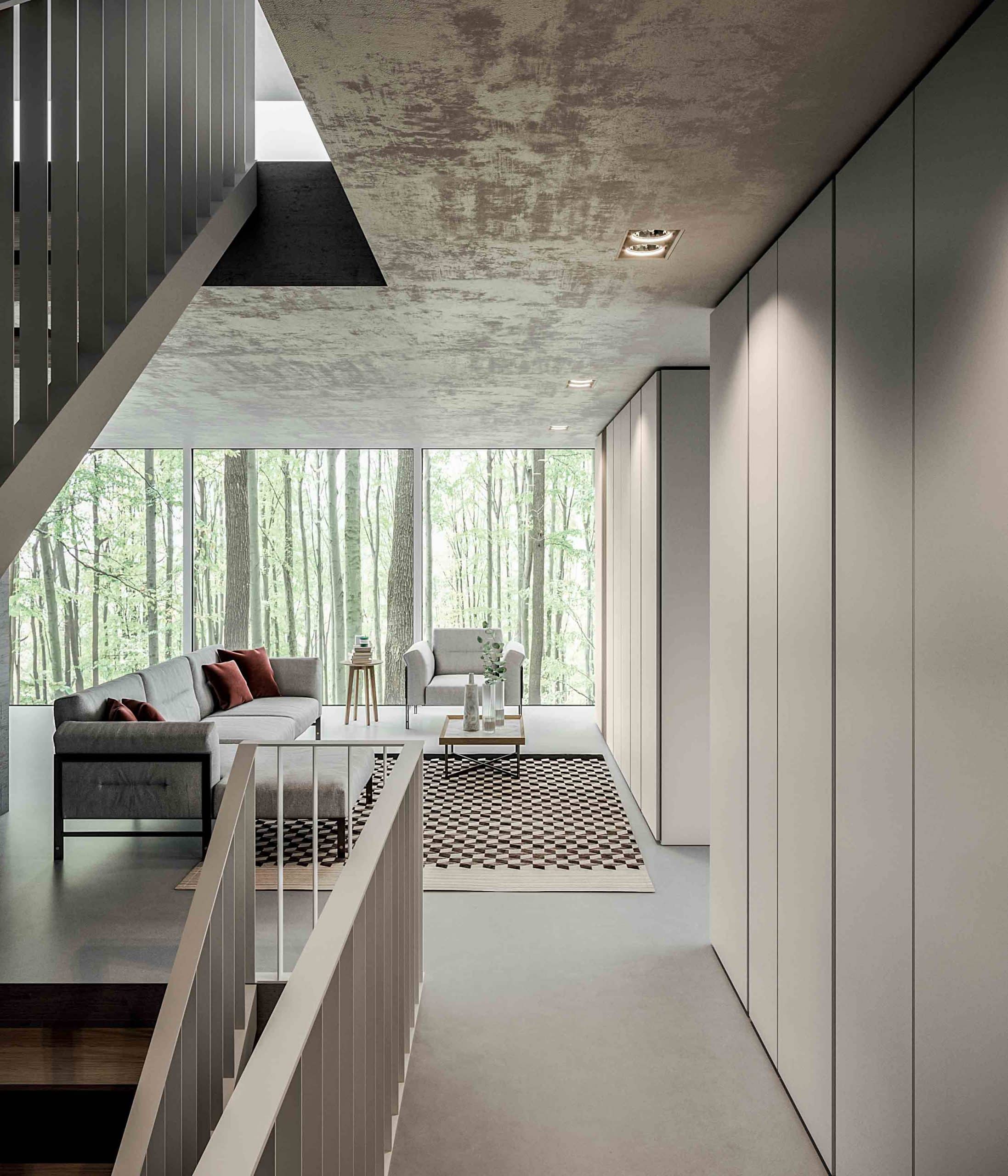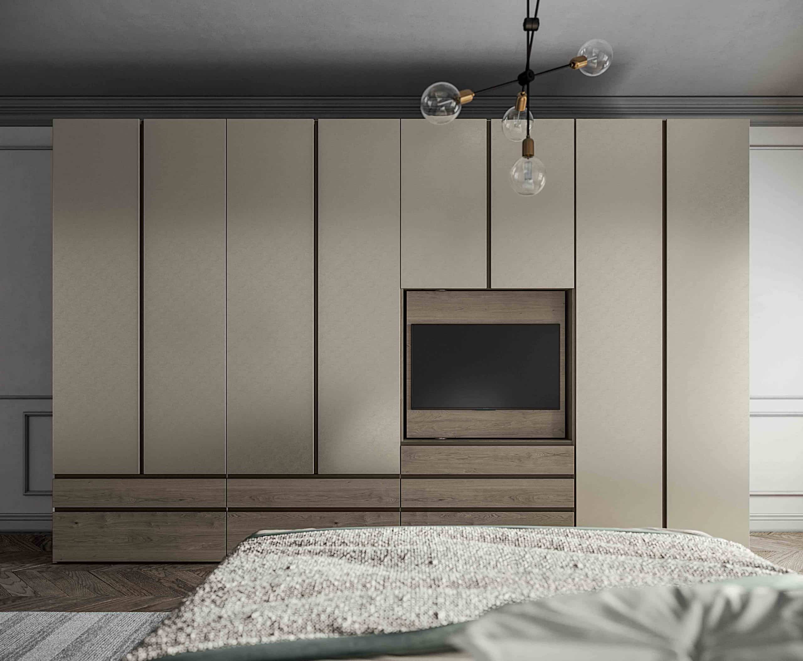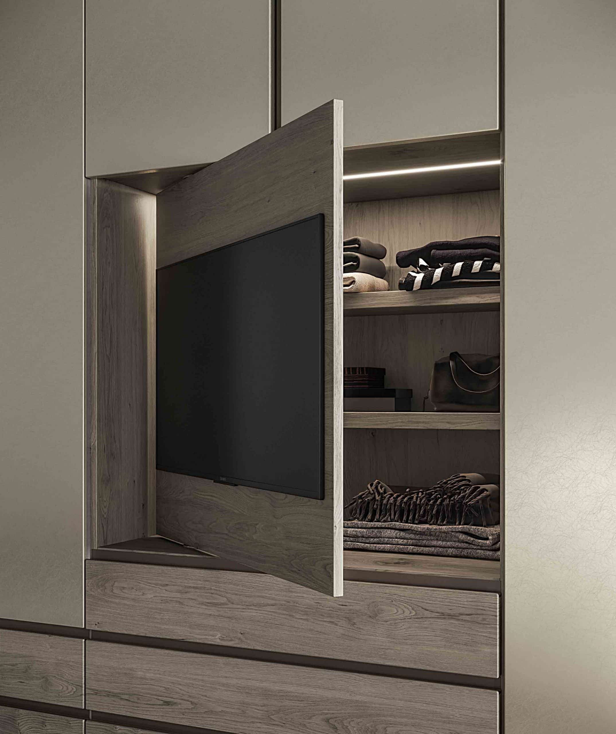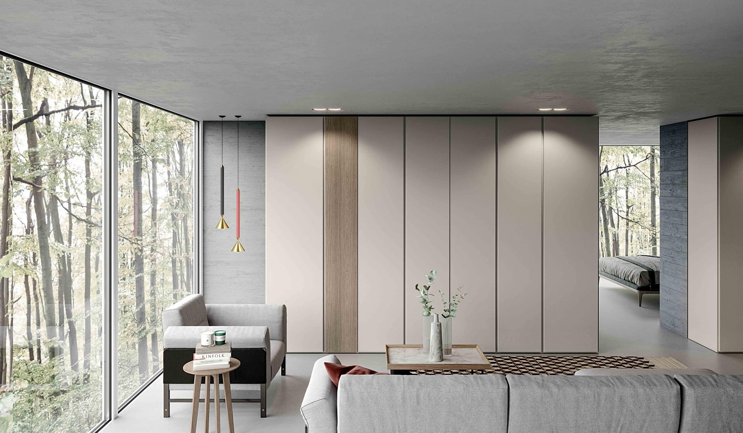 The Tecno hinged door closet is linear and rigorous, capable of reinventing itself thanks to its rich modularity and wide range of finishes. You can choose from wood essences, matte, glossy and special lacquers, and lacquered or mirrored glass.