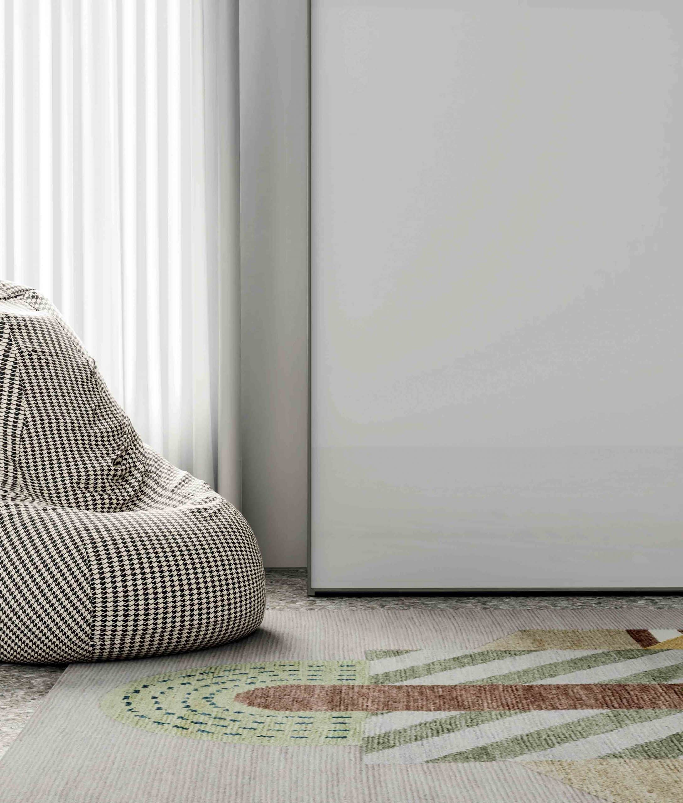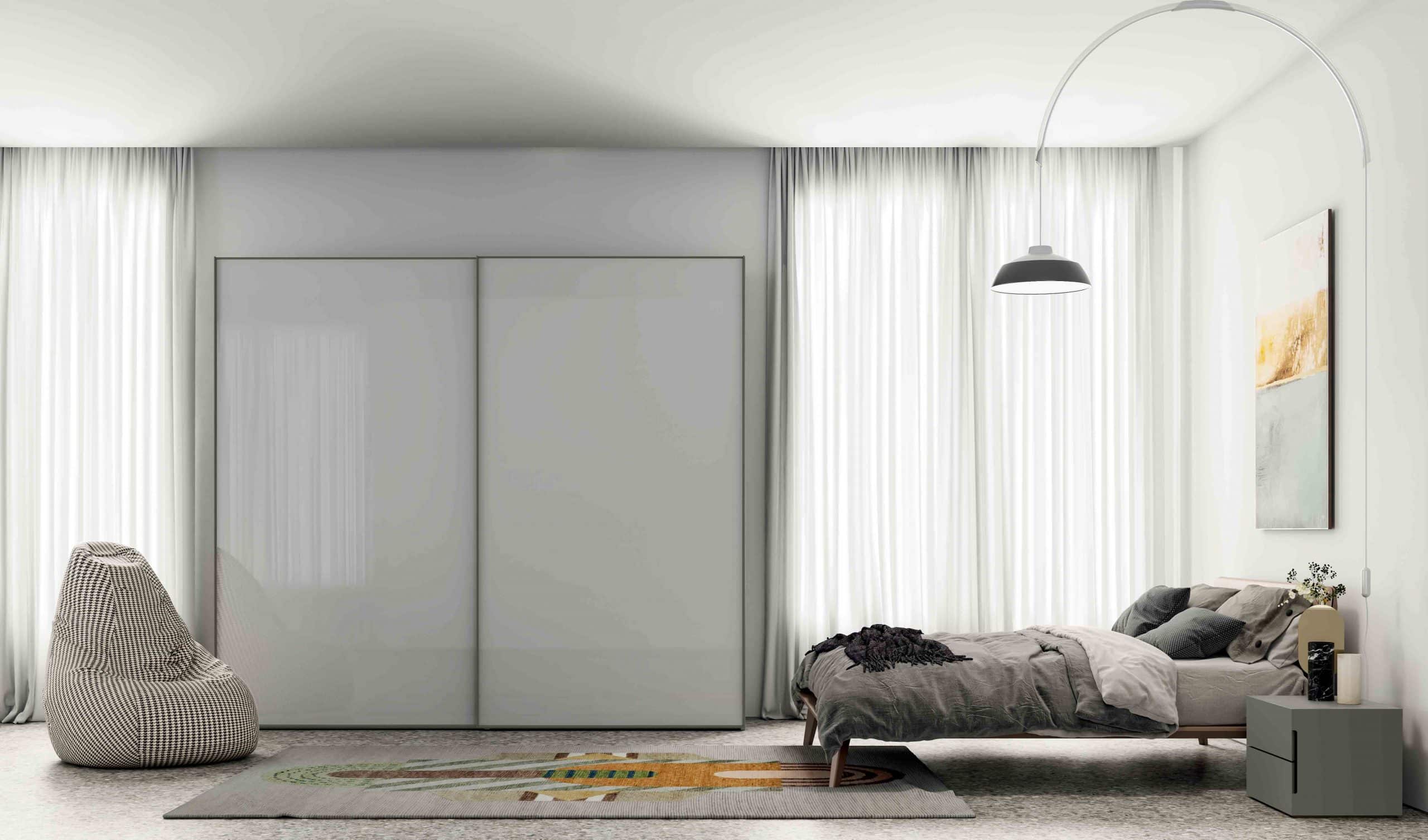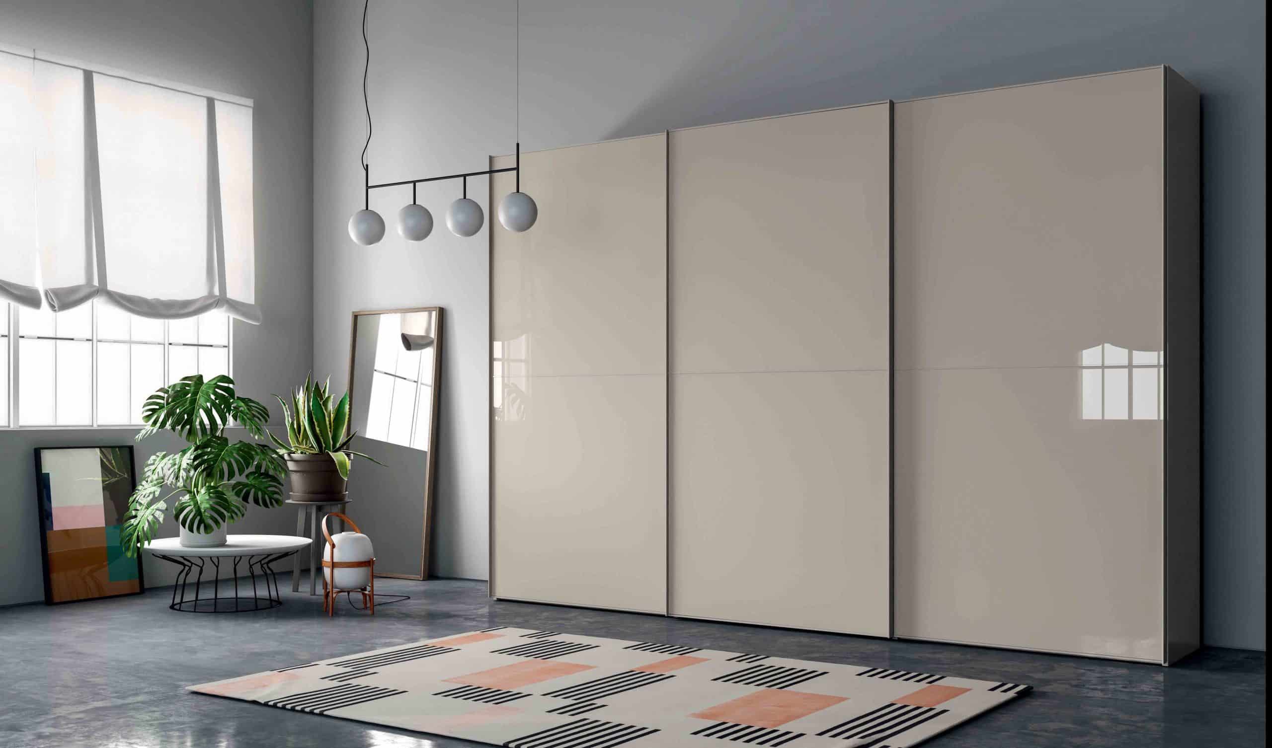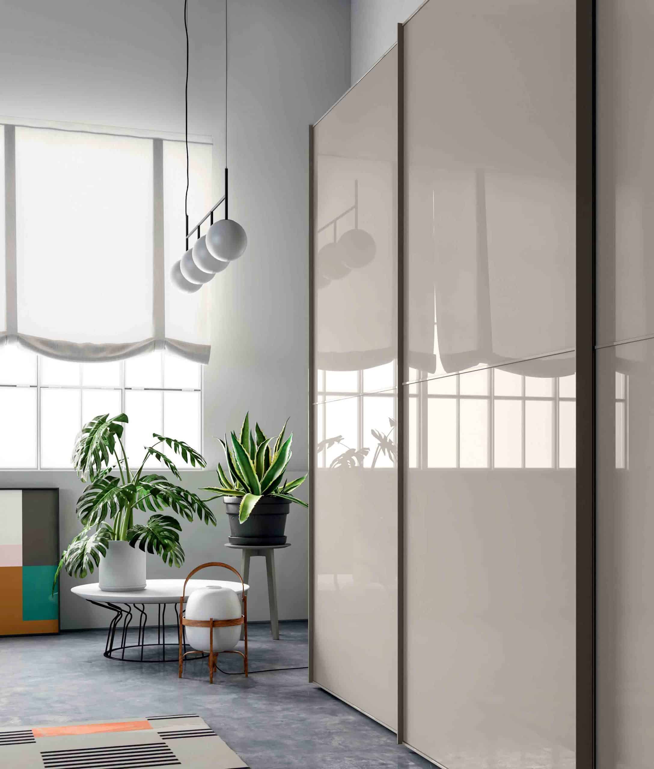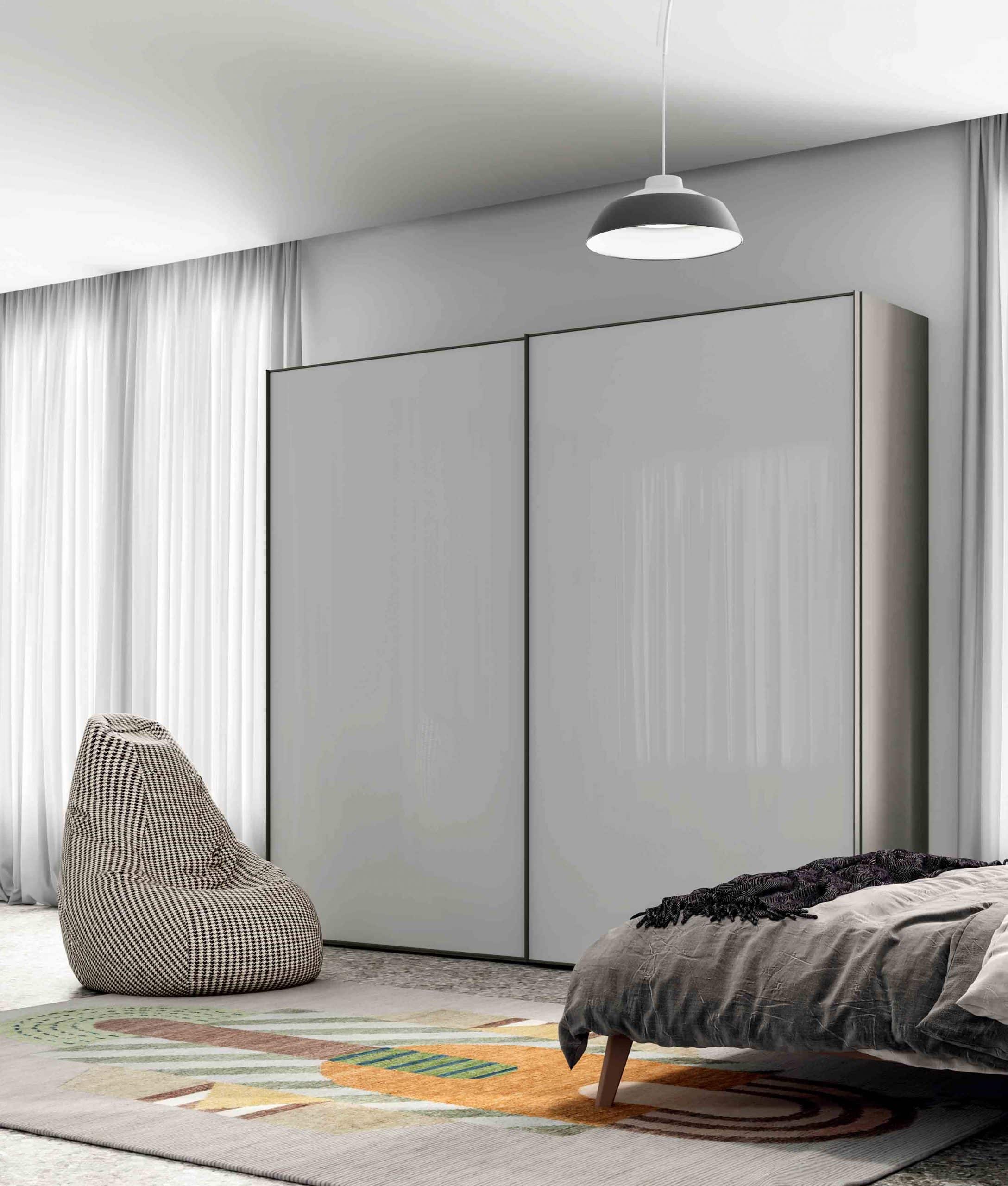 Telaio is a closet with a sliding door characterized by its aluminum frame that seems to embrace the structure but also act as a handle. The door is available in two versions in wood essences, lacquers, lacquered glass or mirror.