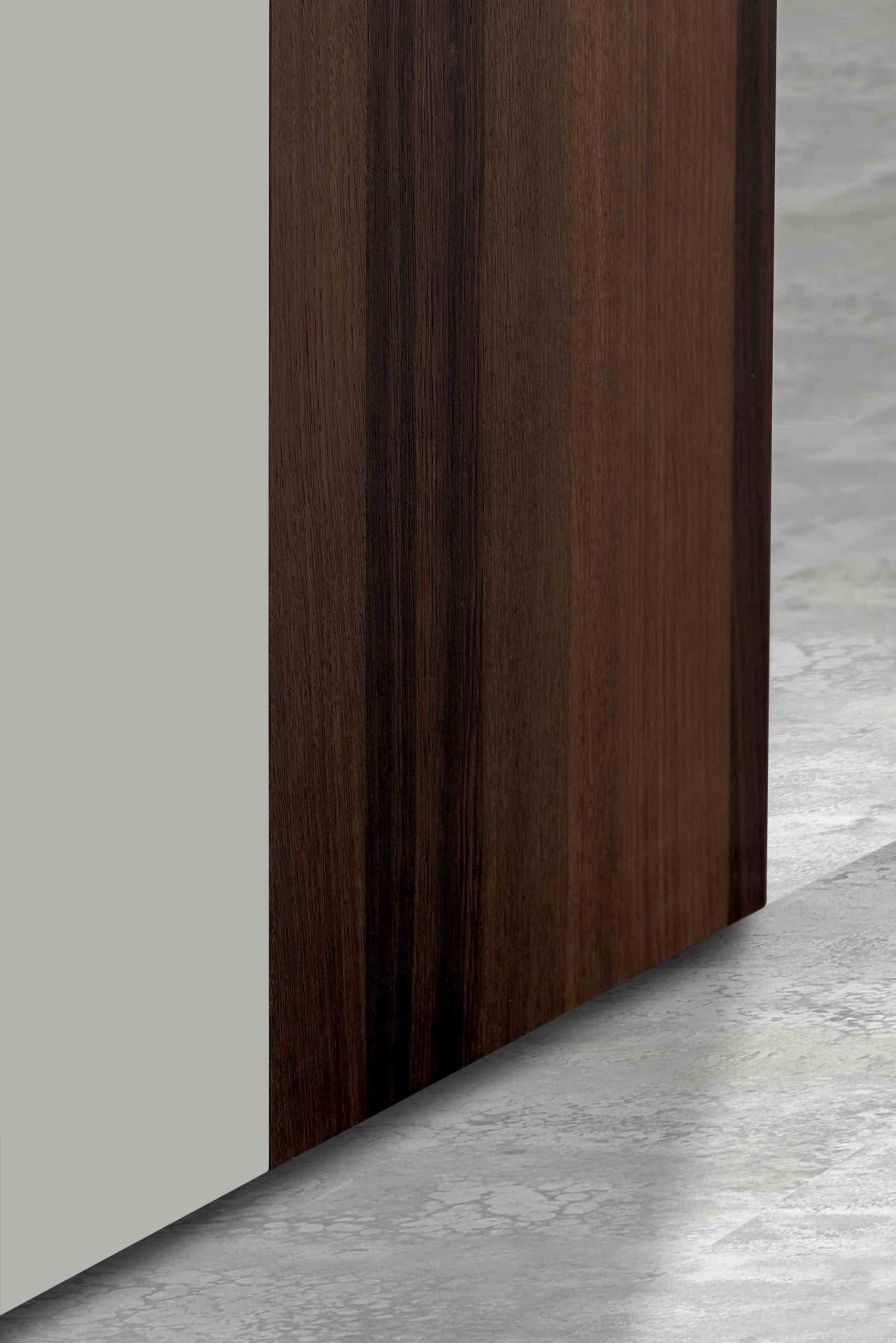 The vertical sliding-door closet plays with the contrasts between different materials and finishes. Each door is divided into two vertical sections of different widths. You can dress the wider one in any of the lacquers and the narrower one also in the wood essences of the Dall’Agnese range.