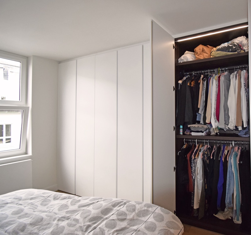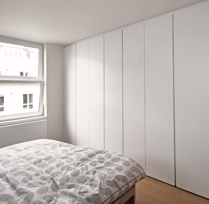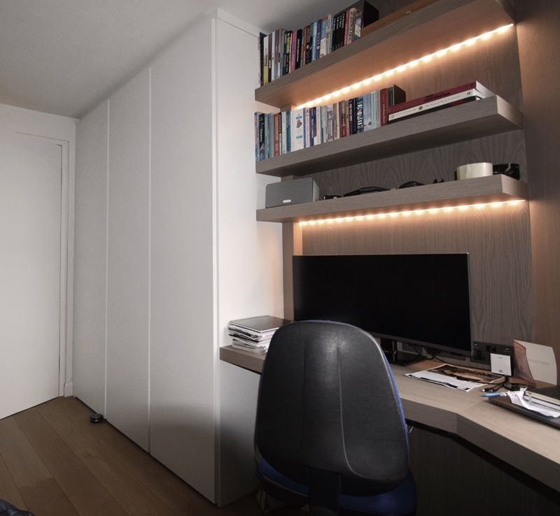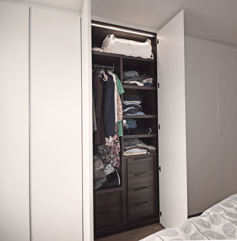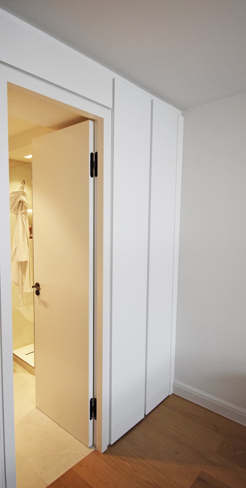 Dall agnese tecno emotion wardrobes, the master wardrobe has a section in in front of the bathroom and the door is part of the wardrobe. All wardrobes are matt lacquered white. There are sensor lights in all the compartments