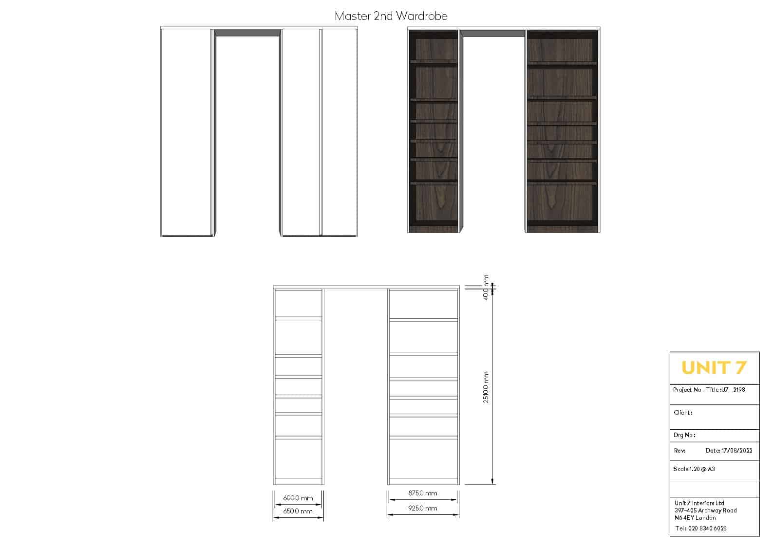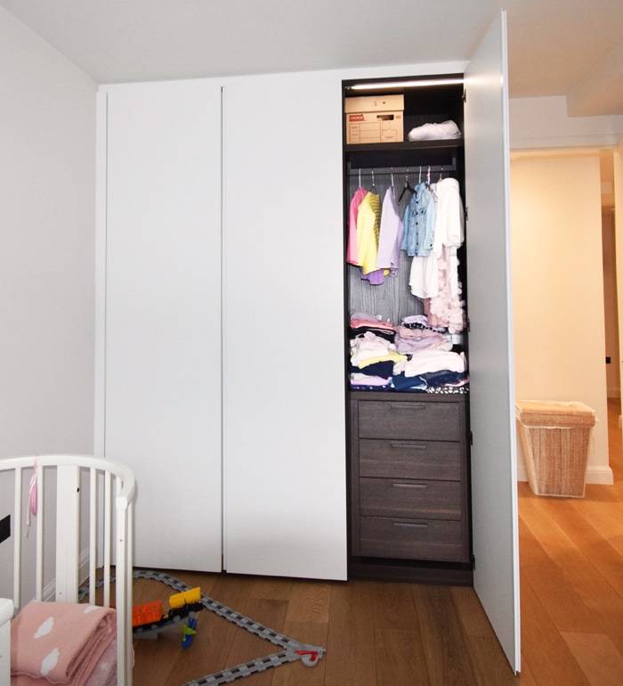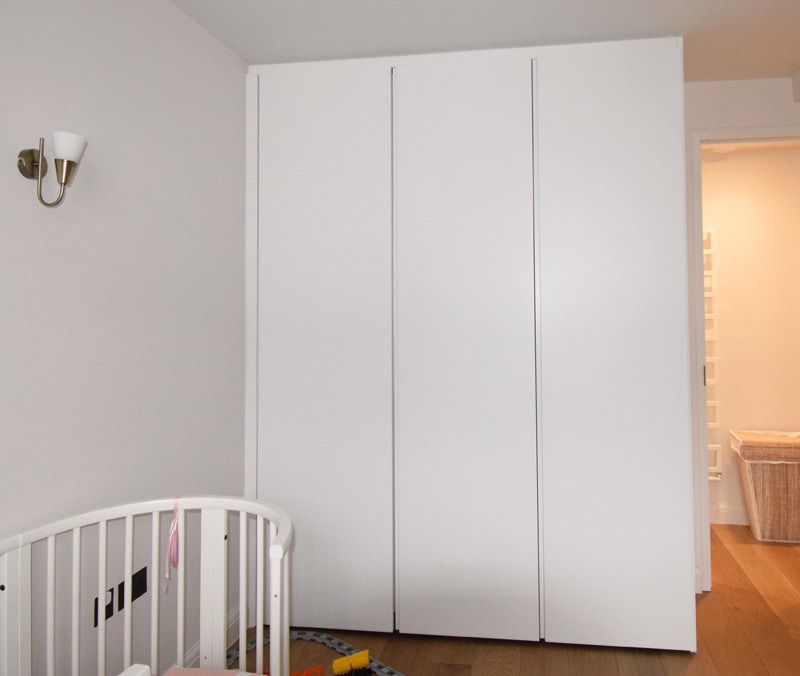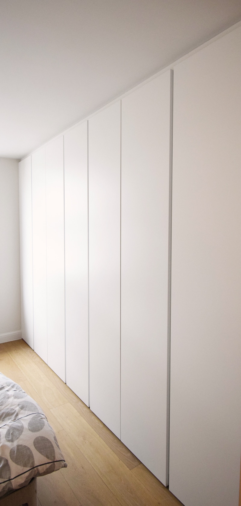 Dall agnese tecno emotion wardrobes, the master wardrobe has a section in in front of the bathroom and the door is part of the wardrobe. All wardrobes are matt lacquered white. There are sensor lights in all the compartments